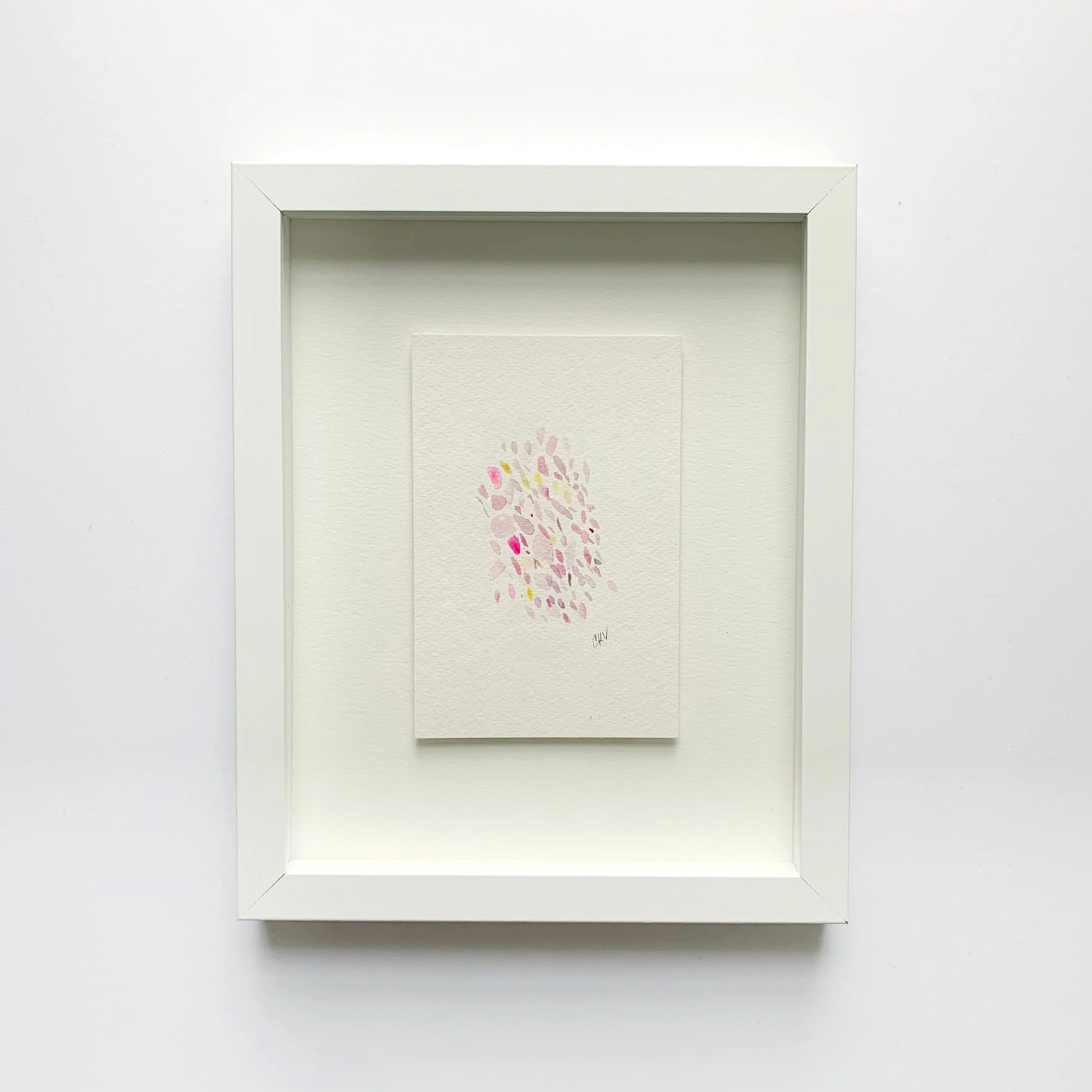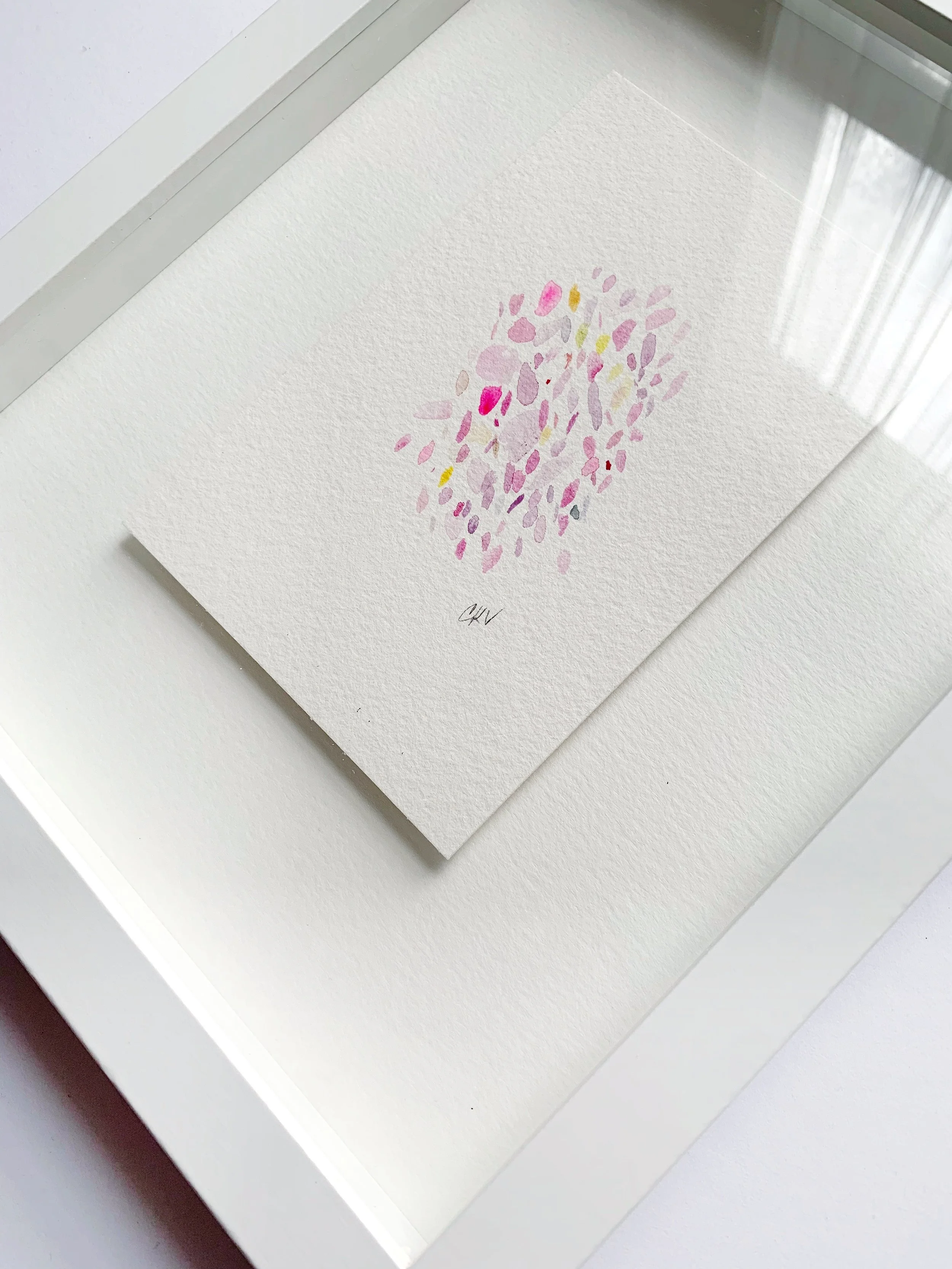 This painting comes FRAMED in a white float frame as seen here. Frame dimensions (outer edge) are 10”x10”
