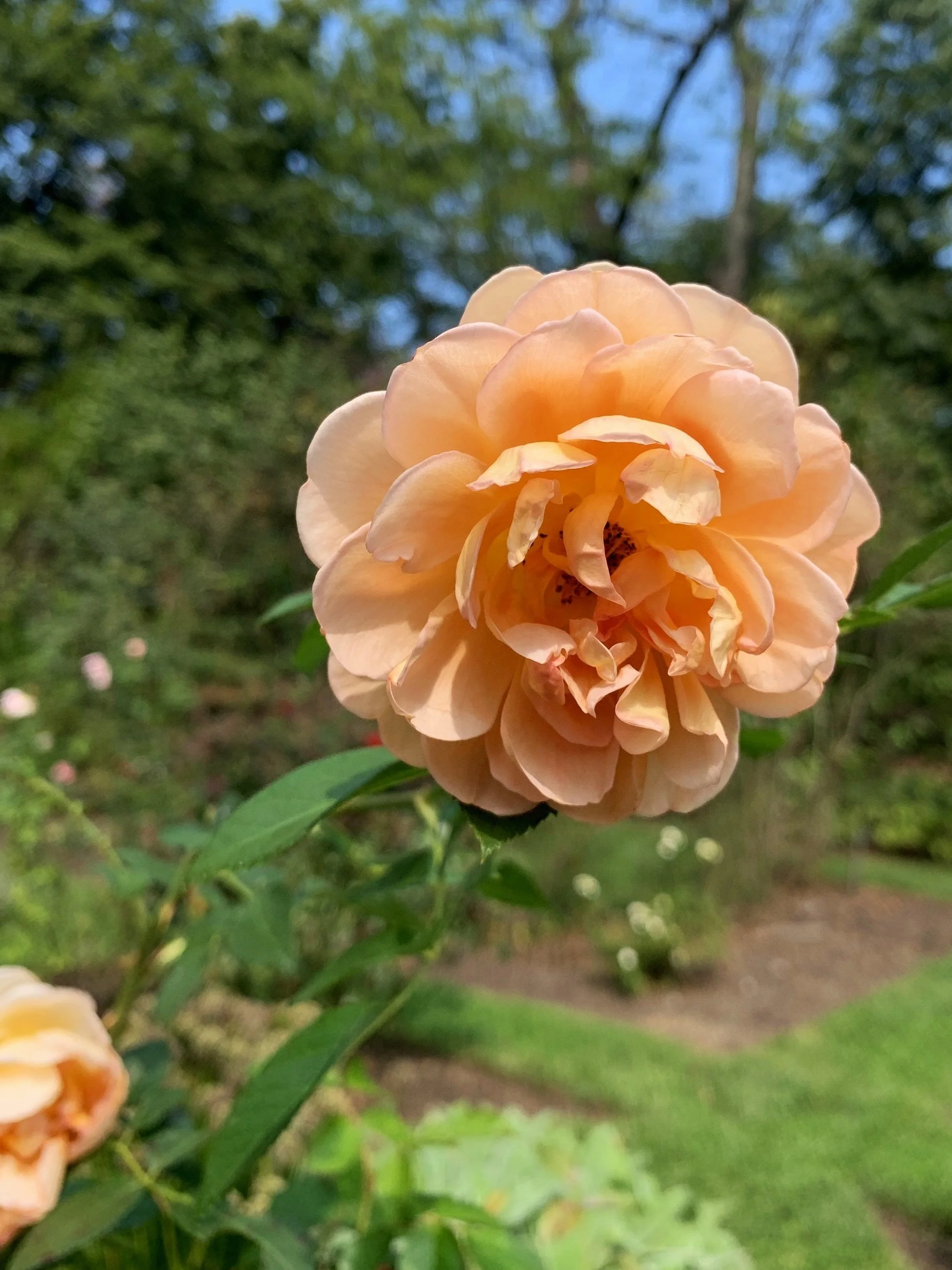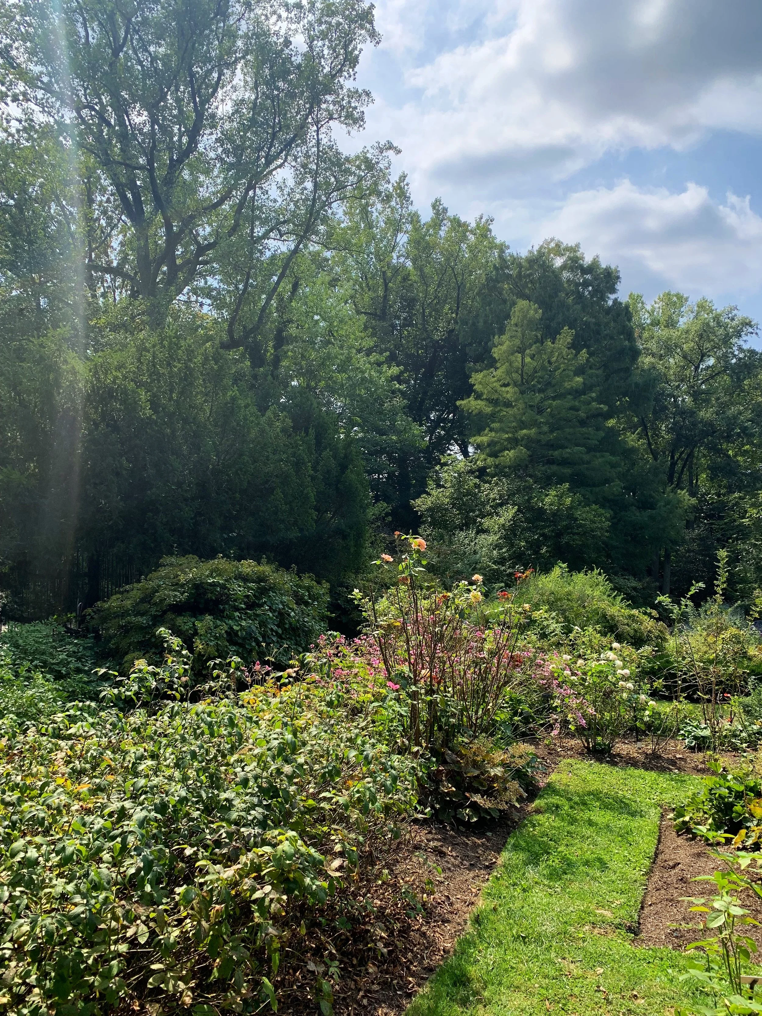 I visited my daughter for Family Weekend at St. Joe’s in Philly on a perfectly late summer type of Saturday. She wanted to go in to the city to shop I wanted to go to the Barnes Foundation Arboretum on the campus…we compromised and did both but I got to go first, cue annoyed 18 year old eye roll. I’m all about exploring a garden or park even if it doesn’t have roses and I wasn’t expecting them here. We were greeted by an enthusiastic student after we passed through the wraught iron gates who handed us a map and pointed at the best way to start to explore…she uttered the words “first you’ll pass through the rose garden,” and I have no idea what she said after that. I was so excited. From where I stood I could see a white trellis with little dots of color blowing in the breeze on the other side (should have been wearing my glasses)
