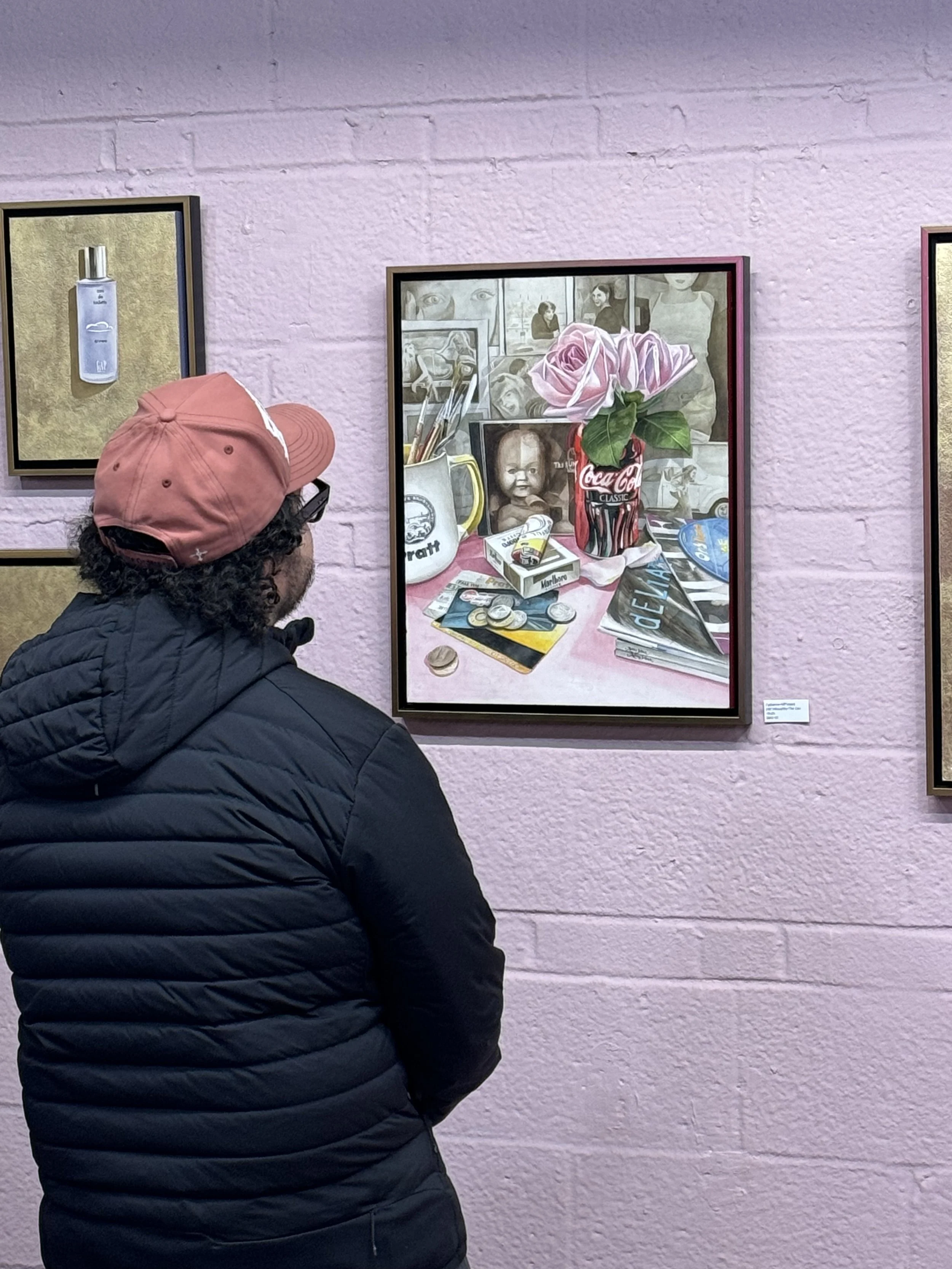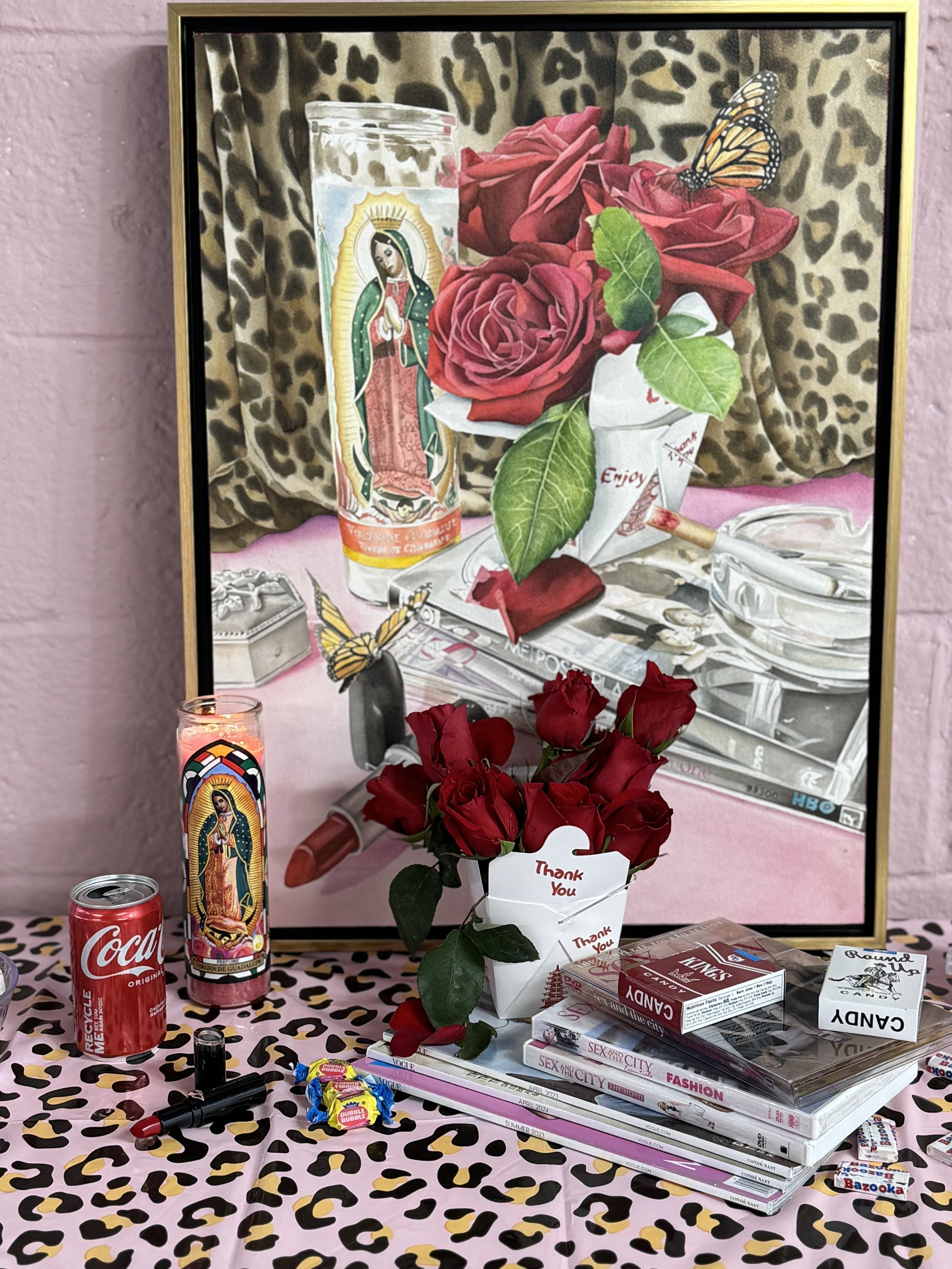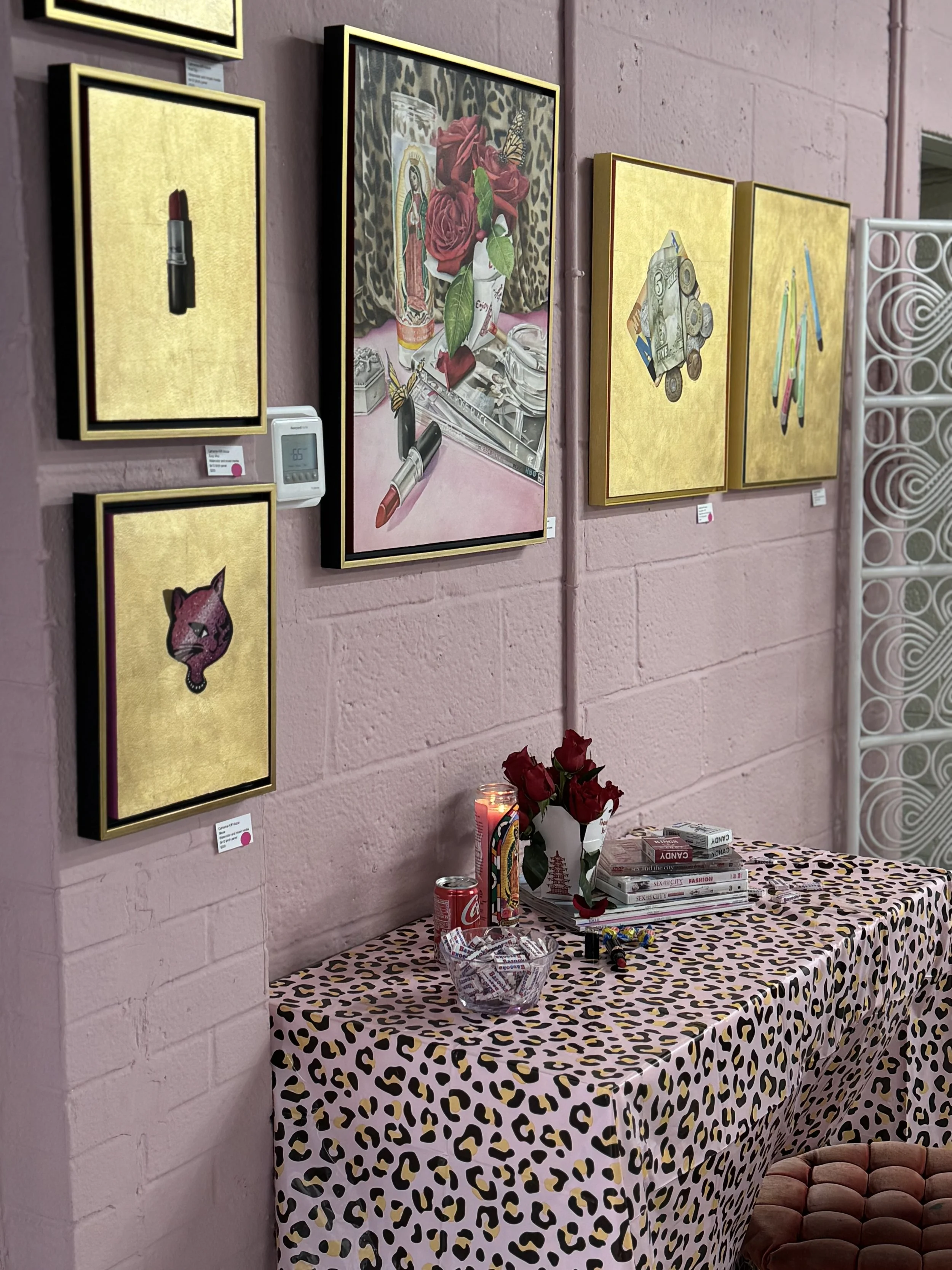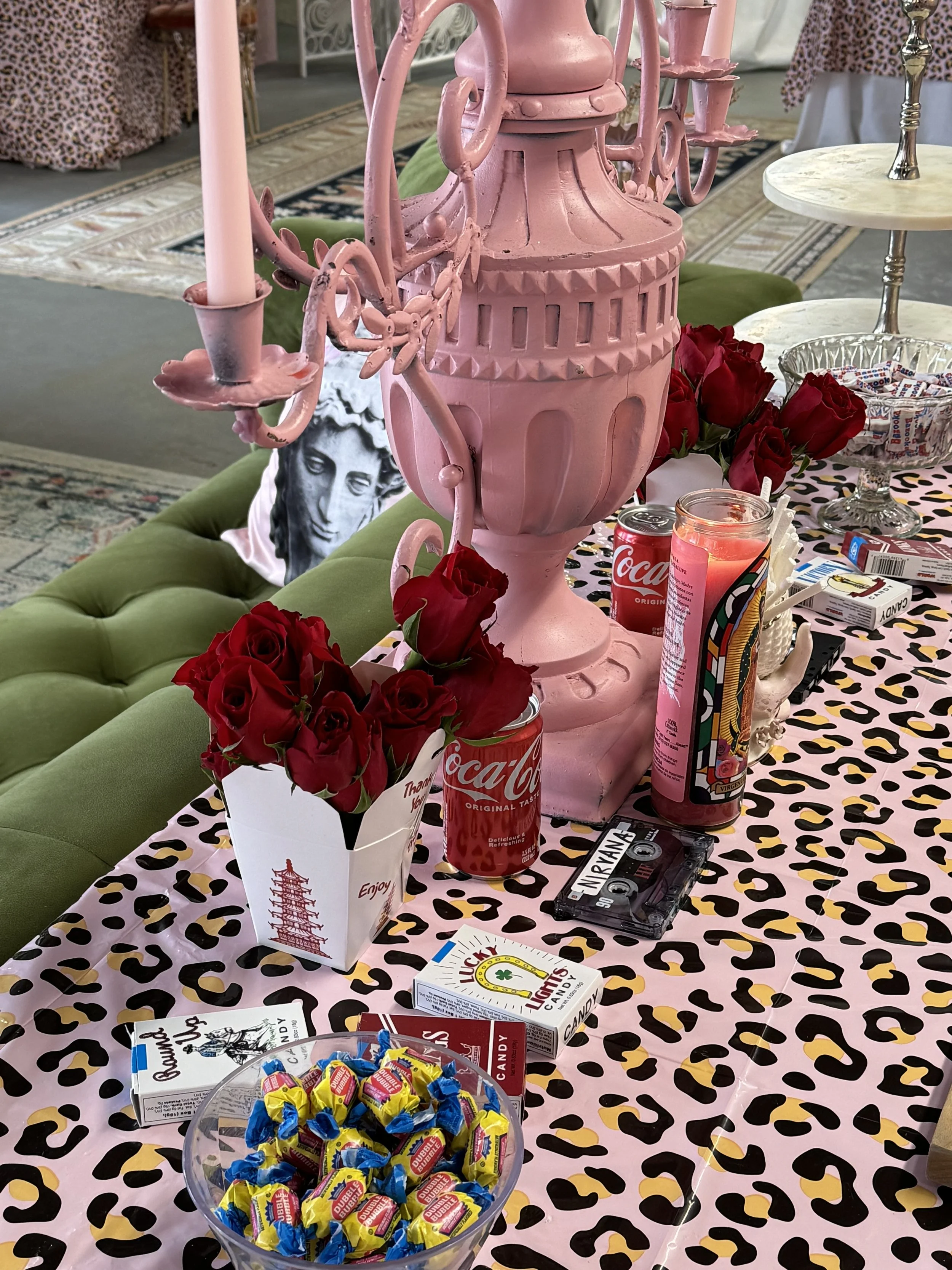 Walking into the gallery and seeing the care Angie and Sarah put into every detail—decor, styling, vibe—I almost lost it. Like, Kim Kardashian ugly cry levels. Leopard print tablecloths. Candy cigarettes. A Barbie Dreamhouse. Chinese takeout containers filled with roses. They didn’t just hang my work—they brought it to life.